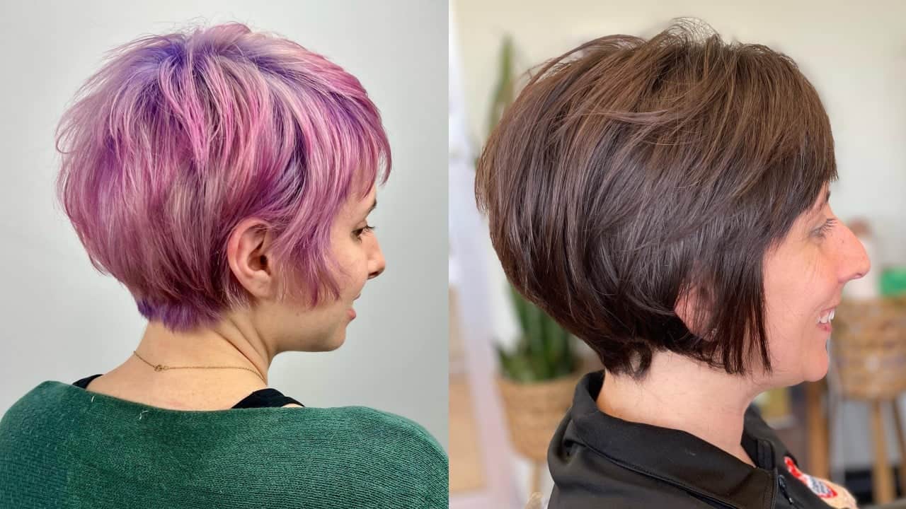 Bixie haircut with pink and purple hues